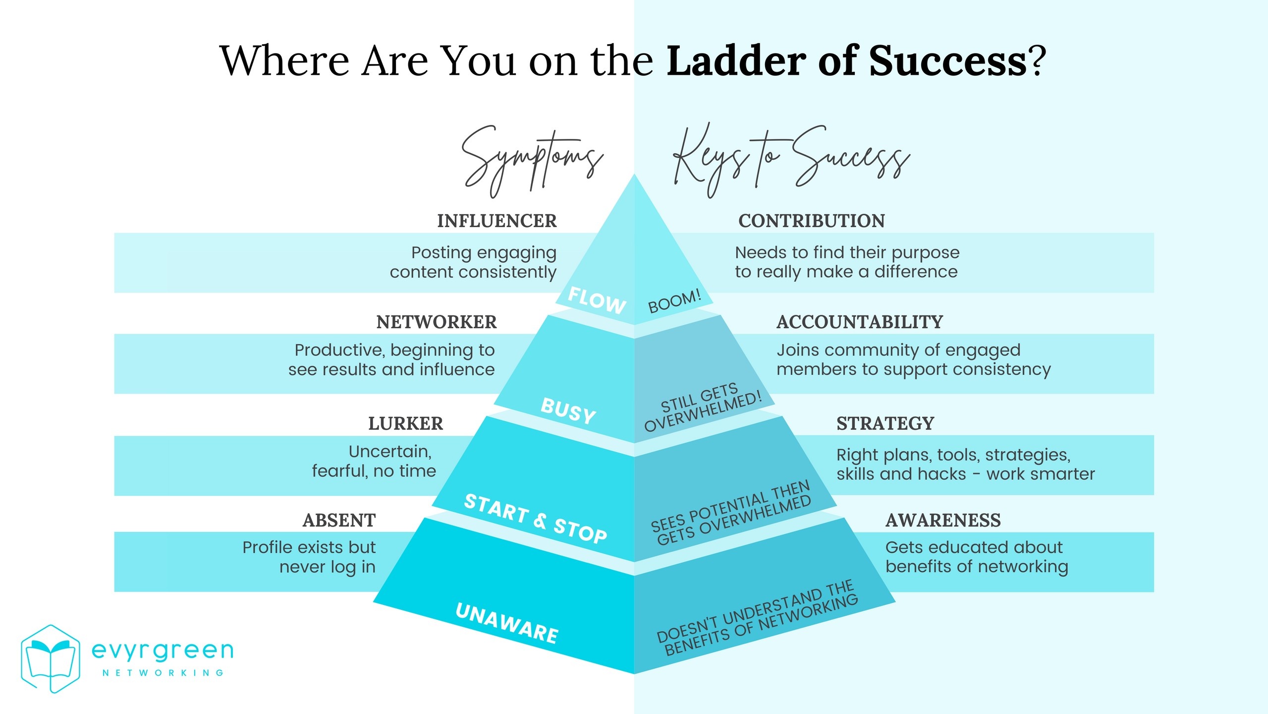 No matter where you are on the ladder of success, we will help you move up to the next level—whether you're a dreamer and you're not taking action; you're a worker and you're spinning your wheels; you're an achiever and you're busy with the urgent over important—we will help you become an influencer and be consistent with your success.